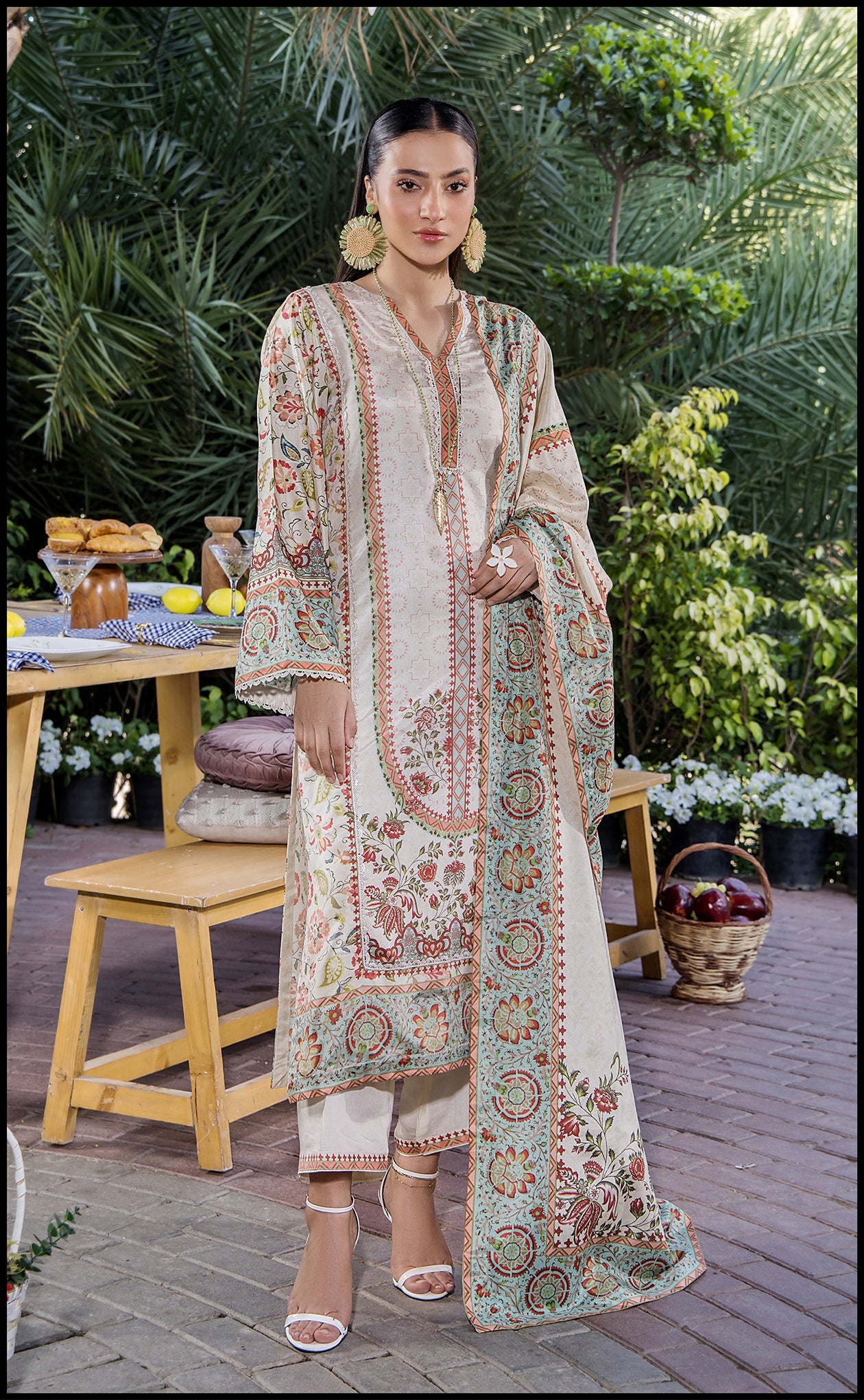 This elegant 3-piece ensemble is crafted from premium raw silk fabric, featuring a long kurta adorned with delicately printed traditional patterns in soft shades of red, green, and beige. Complemented by matching trousers and a richly bordered dupatta, this outfit exudes timeless grace—perfect for garden gatherings or festive luncheons. The luxurious texture and detailed artistry make it a standout choice for refined daytime occasions.
