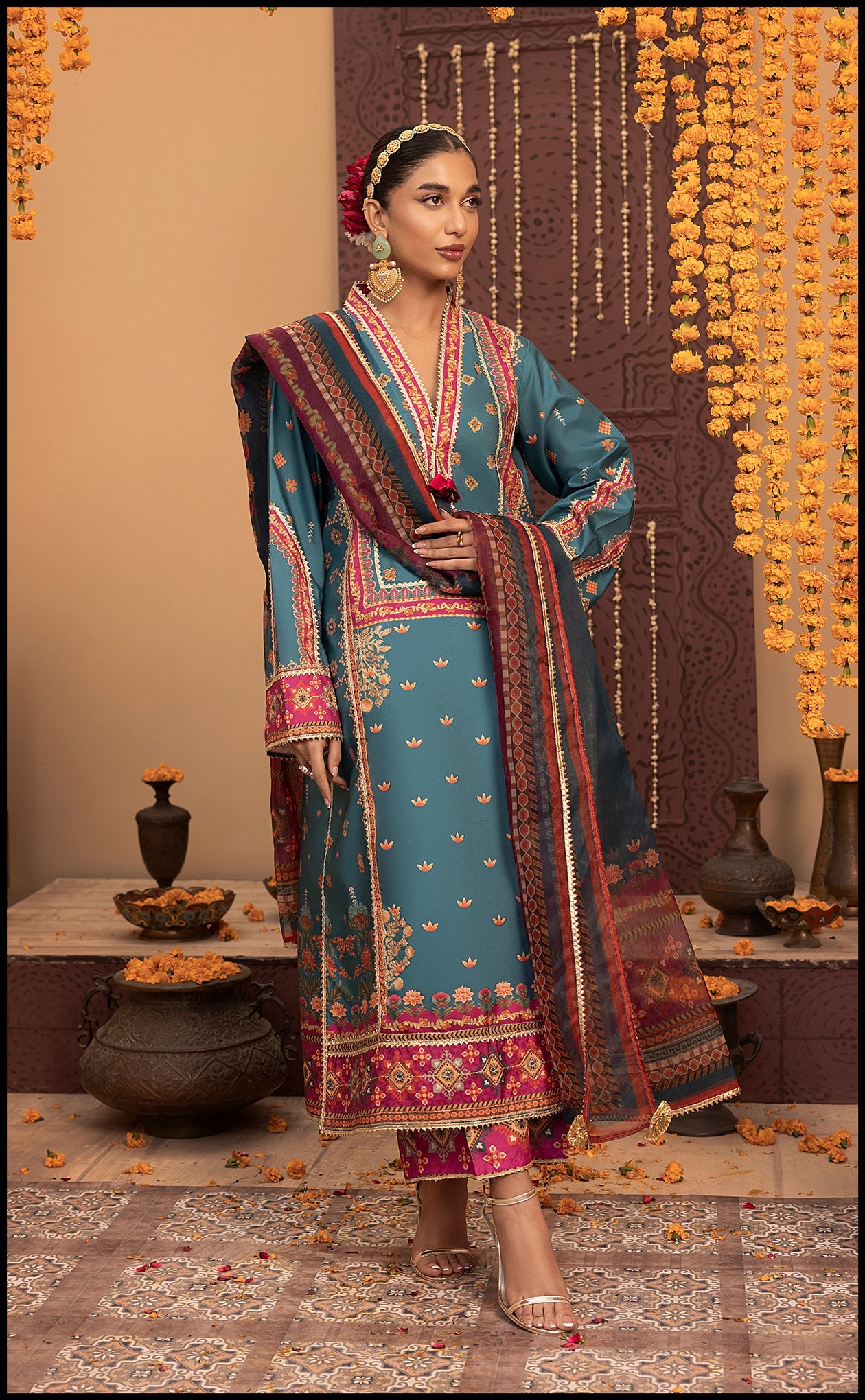 A majestic 3-piece ensemble in premium raw silk, intricately adorned with vibrant embroidery and floral detailing. The teal canvas is beautifully contrasted with rich accents of magenta and gold, creating an opulent look. Paired with an exquisitely designed dupatta featuring striking borders and delicate patterns, this outfit exudes elegance and timeless charm—perfect for festive occasions.