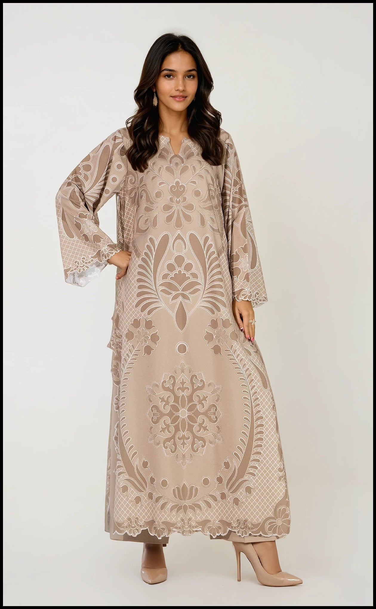Wrap yourself in the rich warmth of the Dune Tapestry. This beautiful printed two-piece is crafted from cozy winter slub fabric in an earthy taupe hue, showcasing a grand, all-over pattern that evokes an antique woven tapestry. The sophisticated look is refined with delicate scalloped edges at the cuffs and neckline, offering a blend of comfort, majestic style, and subtle decorative detail for the colder months.