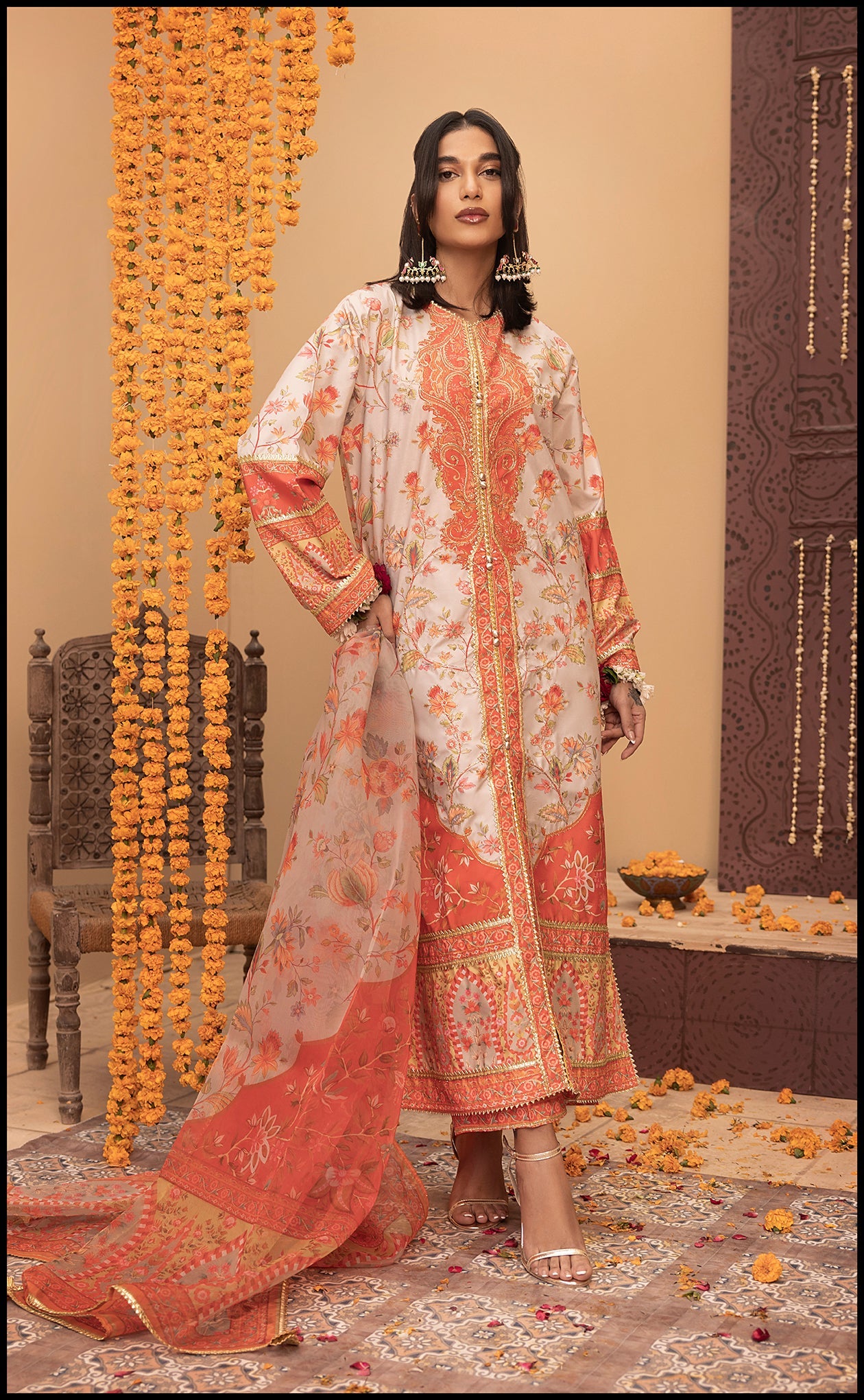 Crafted from premium raw silk, this exquisite 3-piece set features a beautifully embroidered long shirt paired with matching trousers. The intricate floral patterns, vibrant hues of coral and peach, and delicate gold detailing exude timeless elegance. The accompanying add-on dupatta, adorned with coordinating prints and embellishments, enhances the sophistication of the look. Perfect for festive gatherings and formal occasions, this ensemble strikes the perfect balance between tradition and modern charm.