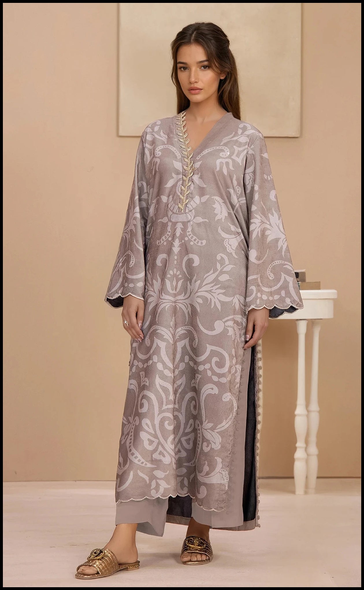 A regal collection of warm, sophisticated suits featuring long kurtas made from intricately printed velvet fabric, paired perfectly with comfortable viscose trousers for a luxurious winter look.