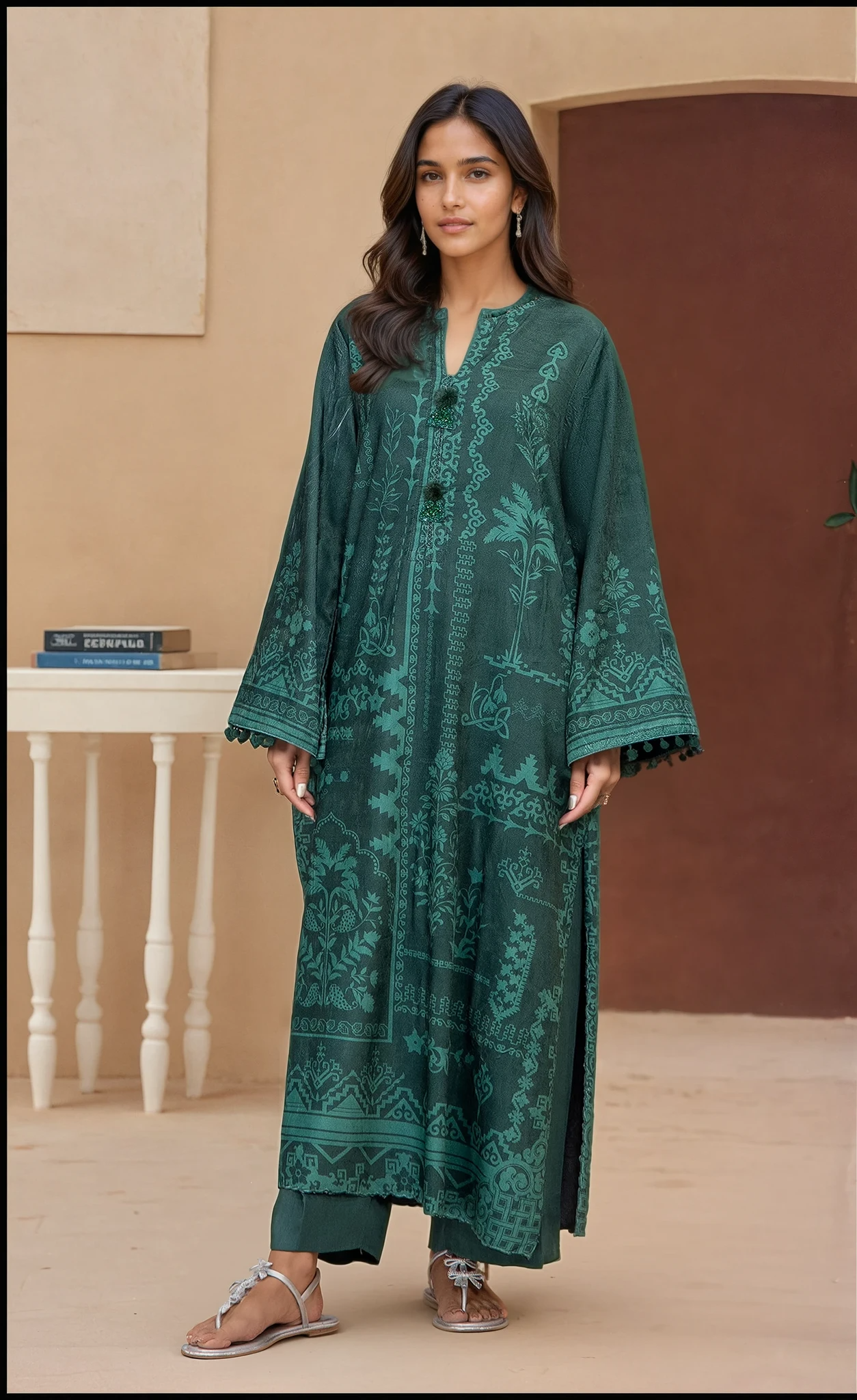 A vibrant and sophisticated ensemble showcasing a long shirt in a striking emerald-green printed velvet fabric. The shirt features an eye-catching geometric and floral print, accented by subtle tassel details at the neckline and cuffs, paired with coordinating viscose trousers.