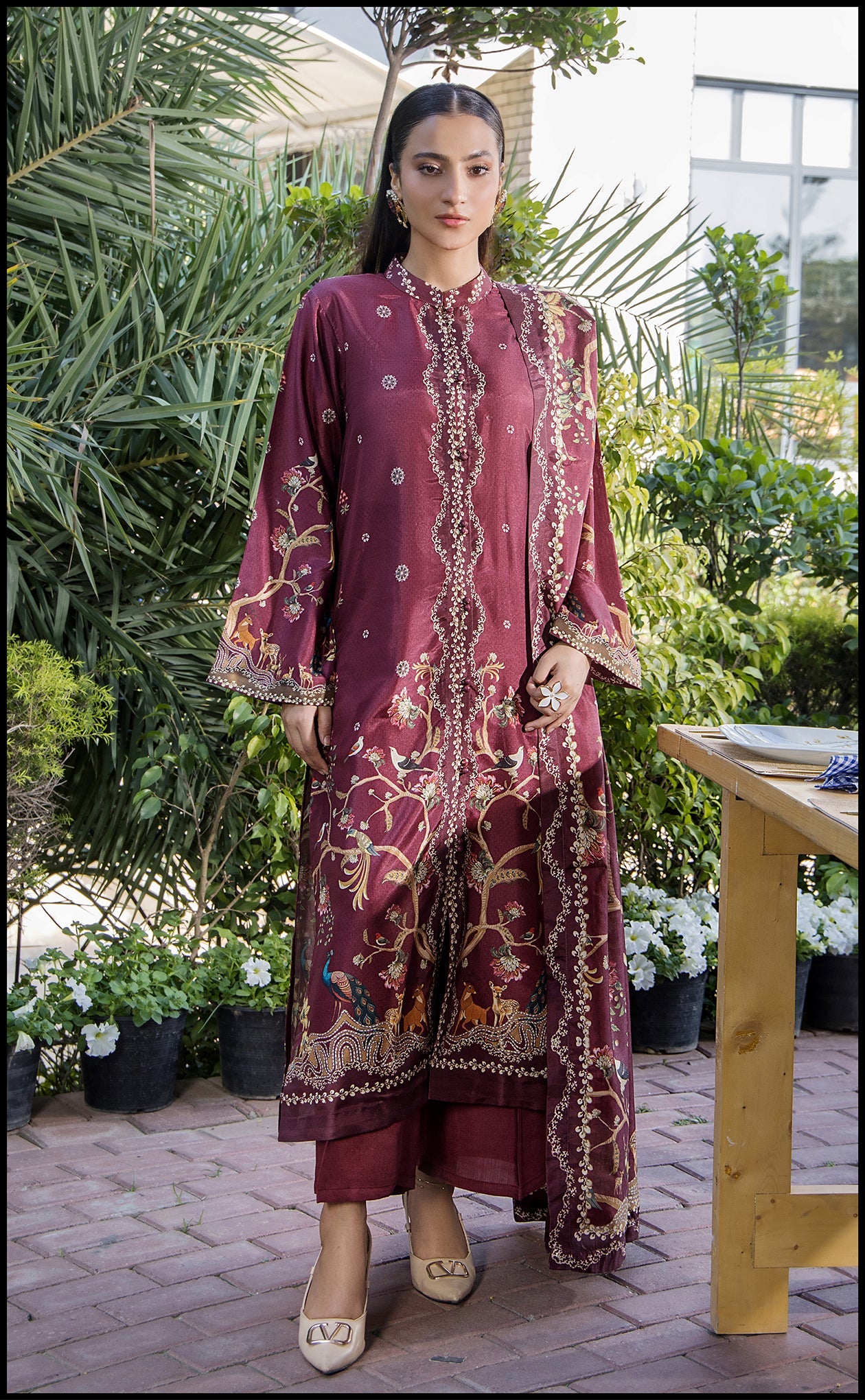 This captivating 3-piece ensemble is crafted from premium raw silk, combining traditional opulence with a modern edge. The shirt showcases elaborate embroidery and enchanting motifs of peacocks and deer amidst gold-threaded vines, while the coordinating dupatta is adorned with intricate patterns that echo the grandeur of the design. Paired with a matching trouser, this set is perfect for festive occasions and winter soirées where elegance is key.