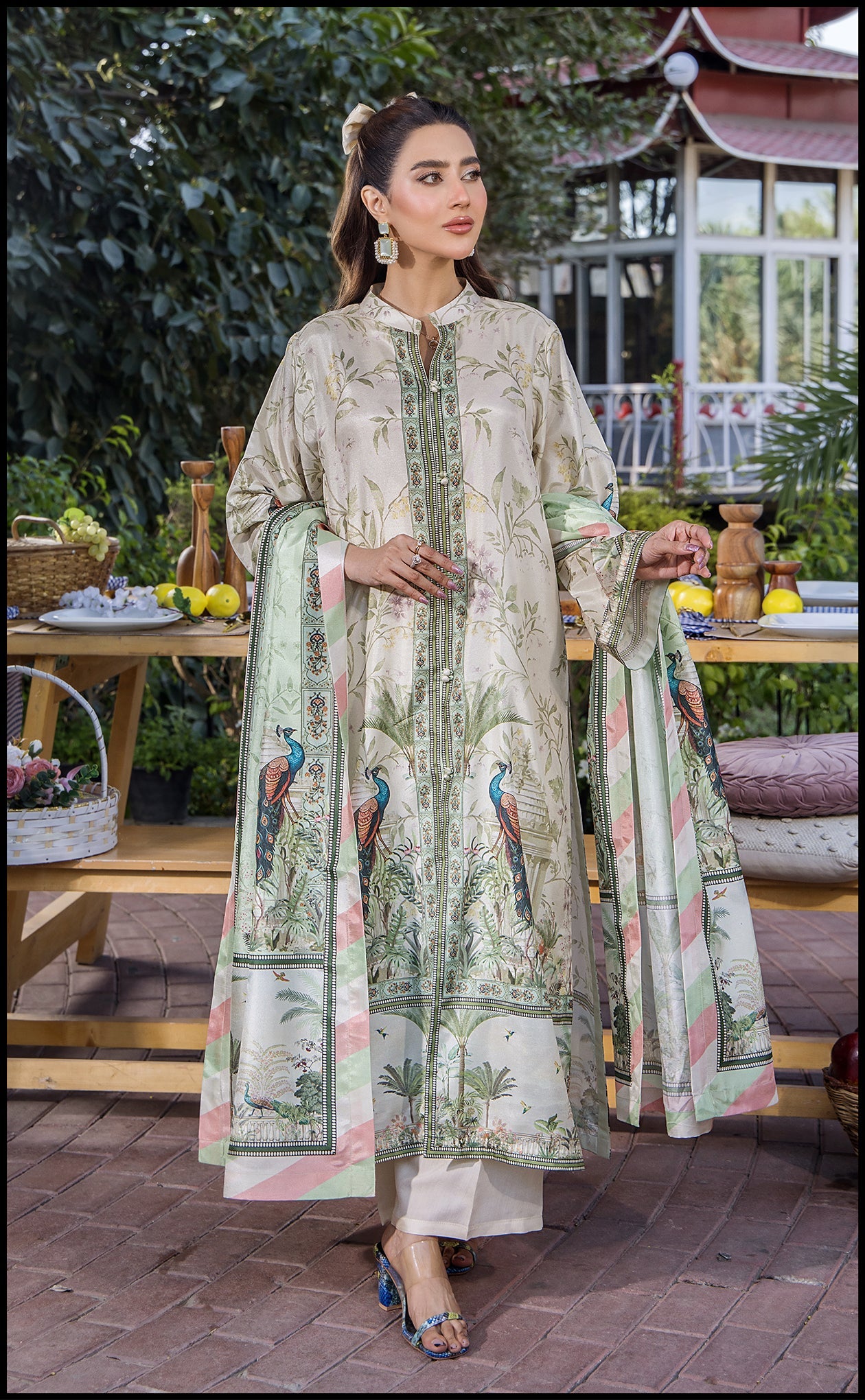 Crafted on premium raw silk, this elegant 3-piece ensemble features a luxuriously printed shirt, complemented by a beautifully illustrated dupatta with majestic peacocks and botanical elements. Delicate embroidery along the neckline adds a refined touch, making it ideal for both festive and semi-formal occasions. The subtle pastel palette enhances the outfit's serene charm, making it a standout in your wardrobe.