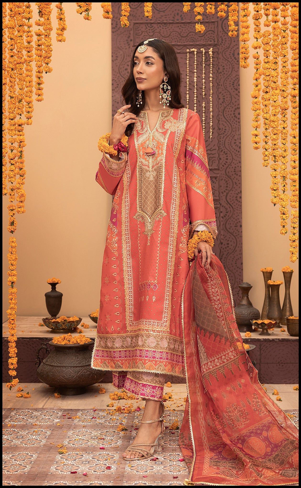 This exquisite 3-piece set features a beautifully tailored shirt and matching trousers, both crafted from luxurious raw silk. The intricate embroidery, vibrant design patterns, and rich color palette add an air of sophistication. Accompanied by a coordinating dupatta, this outfit offers versatility, perfect for festive occasions or formal gatherings. The detailed finishing and timeless silhouette make this ensemble a must-have addition to your wardrobe.