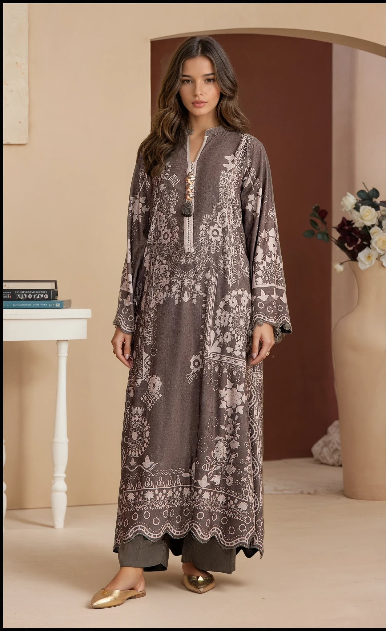 A sophisticated look showcasing a straight long kurta crafted from rich brown/taupe printed velvet. The contrasting, lighter-hued floral and motif print is balanced by a simple tassel neckline, paired with comfortable, coordinating viscose trousers.