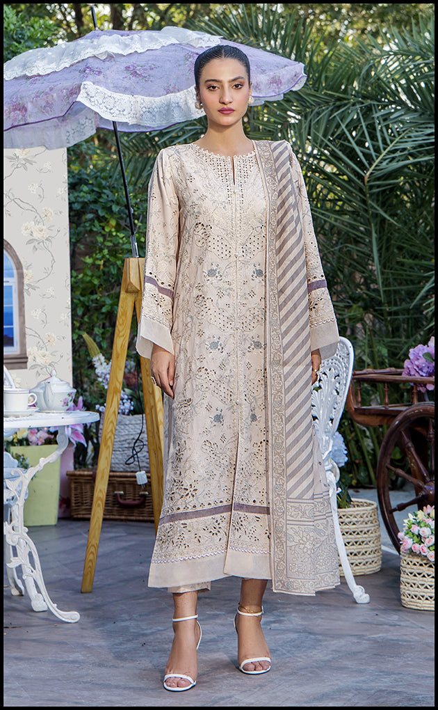 Embrace elegance in our delicately embroidered beige ensemble, featuring a beautifully crafted PP lawn silk shirt, a gracefully printed voile dupatta, and complementing printed trousers.