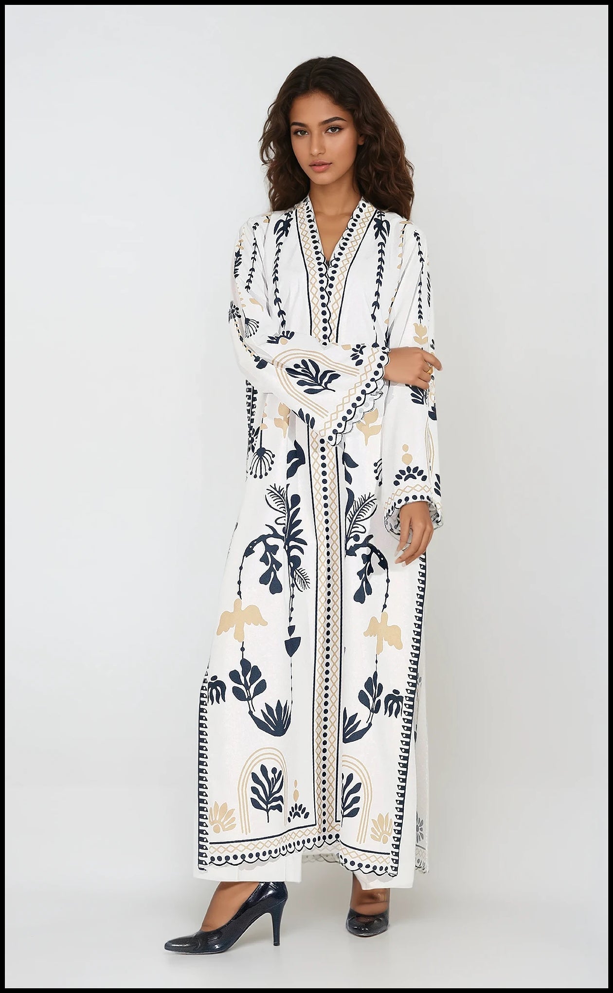 Embrace the drama of the Obsidian Bloom. This luxurious printed winter slub set boasts a vibrant botanical print in rich black, crisp white, and warm gold accents. The unique V-neckline and full-length border create a stunning, elongated silhouette. The design is perfected with delicate scalloped edges finishing the cuffs and hemline, adding a final layer of texture and decorative refinement to this contemporary and timeless outfit.