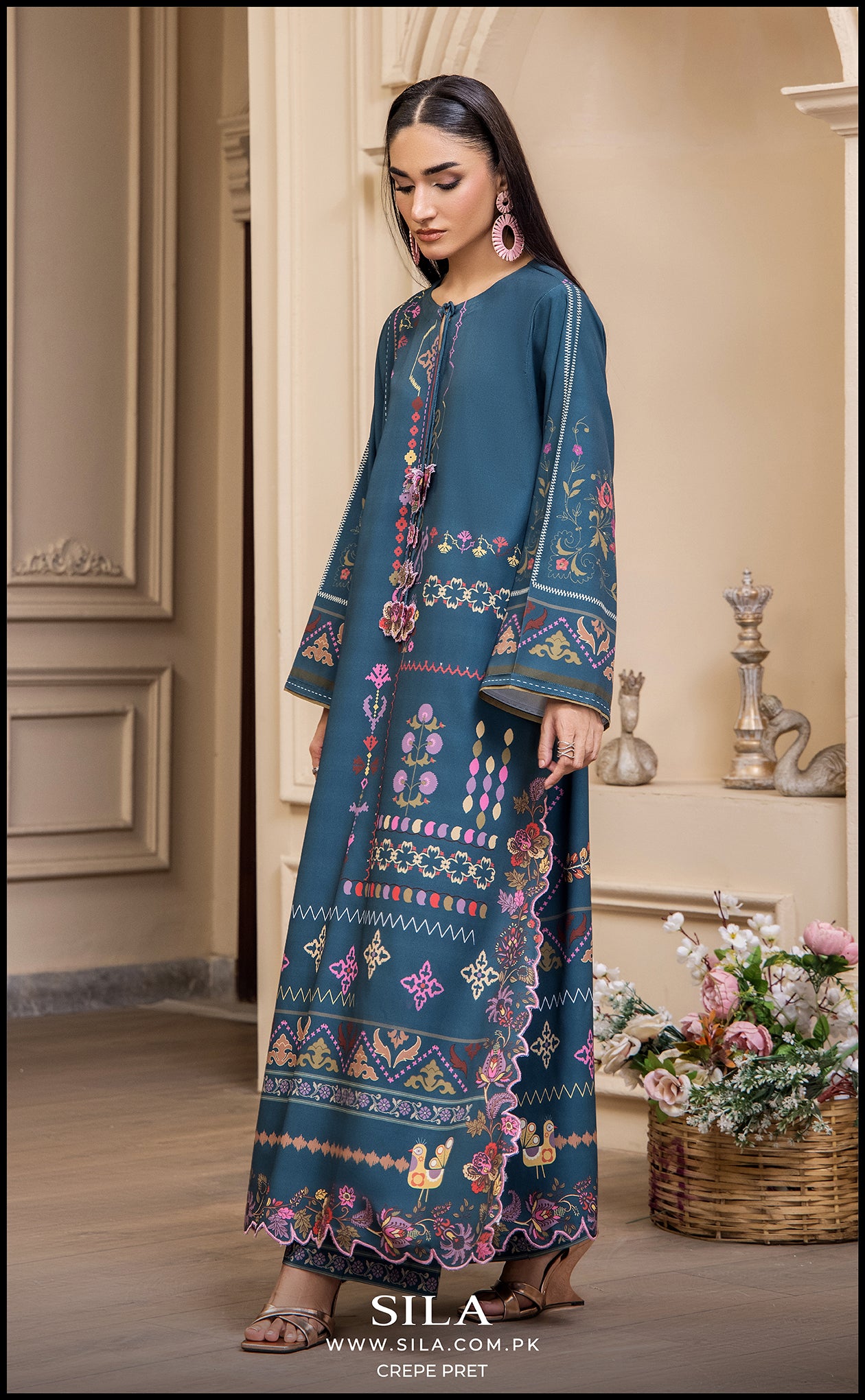 This striking 2-piece ensemble is made from luxurious, flowing printed crepe fabric in a deep teal shade. The long-length shirt features an exquisite digital print, showcasing a beautiful blend of floral and geometric motifs in vibrant shades of pink, purple, and gold. The design is further enhanced by decorative tassel detailing at the neckline, adding a sophisticated, ready-to-wear finish. The set includes a matching trouser to create a cohesive and elegant look, perfect for any festive or semi-formal occasion. 🌺