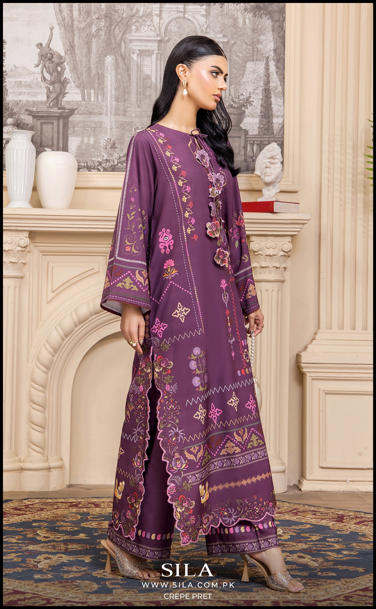 This striking 2-piece ensemble is made from luxurious, flowing printed crepe fabric in a rich, captivating plum color. The long-length shirt showcases an exquisite digital print featuring floral and geometric motifs in shades of lilac, pink, and gold. The design includes a stylishly split hem and is further enhanced by decorative tassel detailing at the neckline, adding a sophisticated, ready-to-wear finish. The set includes a matching trouser to create a cohesive and elegant look, perfect for any festive or semi-formal occasion. 🌸