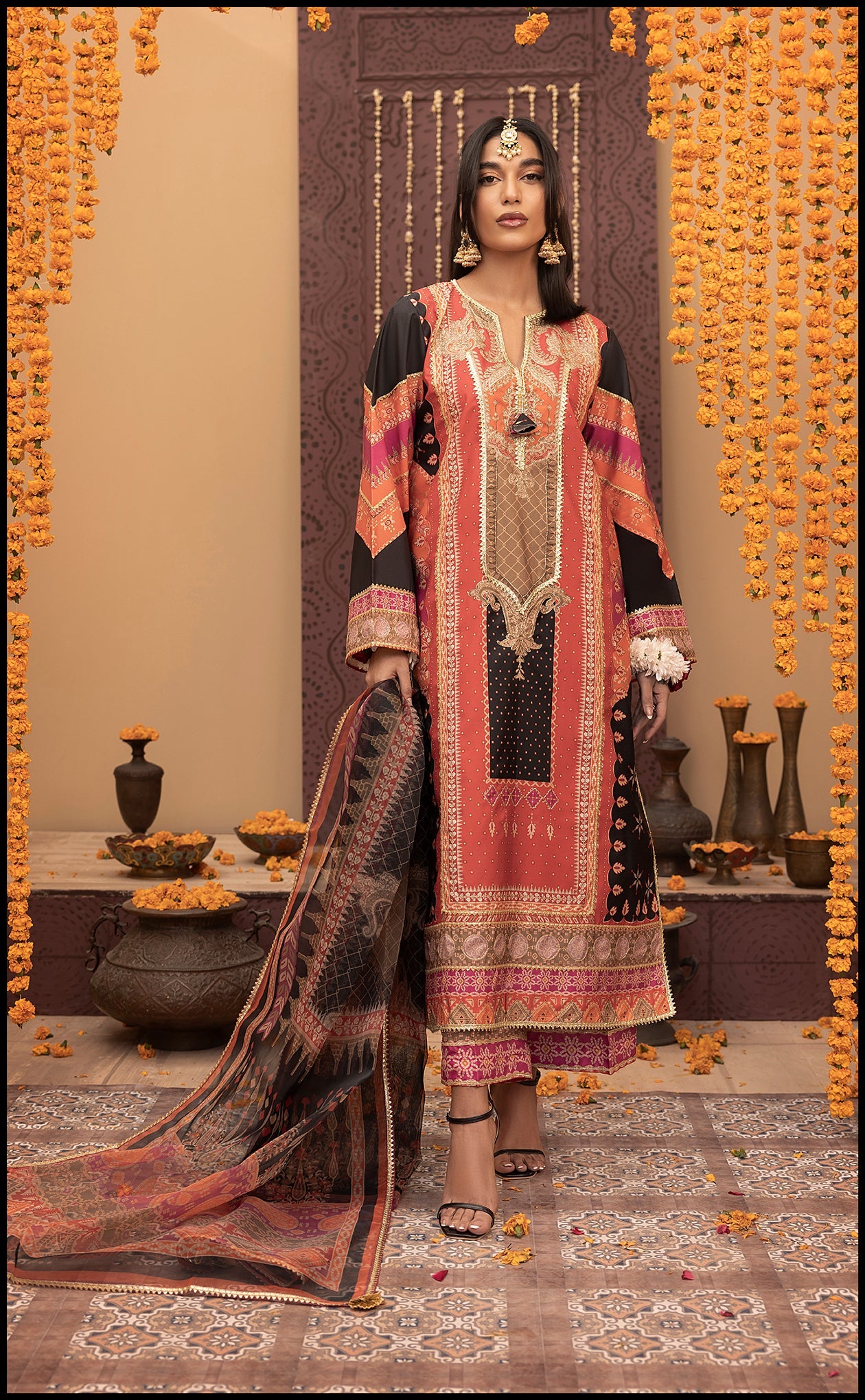 A luxurious 3-piece suit crafted from premium raw silk, featuring a timeless traditional design. The intricate embroidery and ornate motifs add elegance, while the striking colors blend contemporary style with cultural heritage. Paired with an add-on printed silk dupatta, this ensemble exudes sophistication, making it perfect for festive occasions and celebrations.