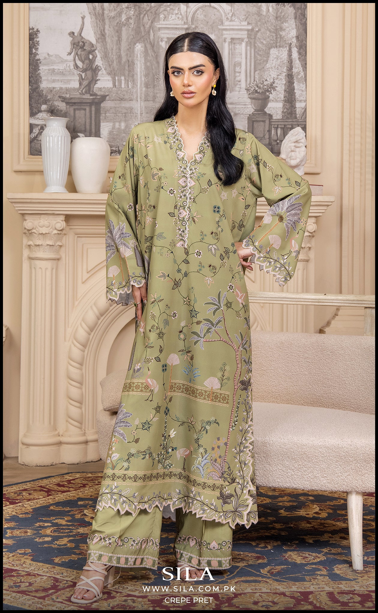 This beautiful 2-piece ensemble is crafted from luxurious, flowing printed crepe fabric in a serene sage green shade. The long-length shirt features an exquisite digital print, showcasing delicate, nature-inspired motifs including florals and foliage in soft complementary tones of lilac, pink, and subtle brown. The sleeves and hemline are finished with decorative scalloping, enhancing its elegant appeal. The set includes a matching wide-leg trouser (implied by to create a cohesive, ready-to-wear look, perfect for a sophisticated daytime or semi-formal event. 🌿