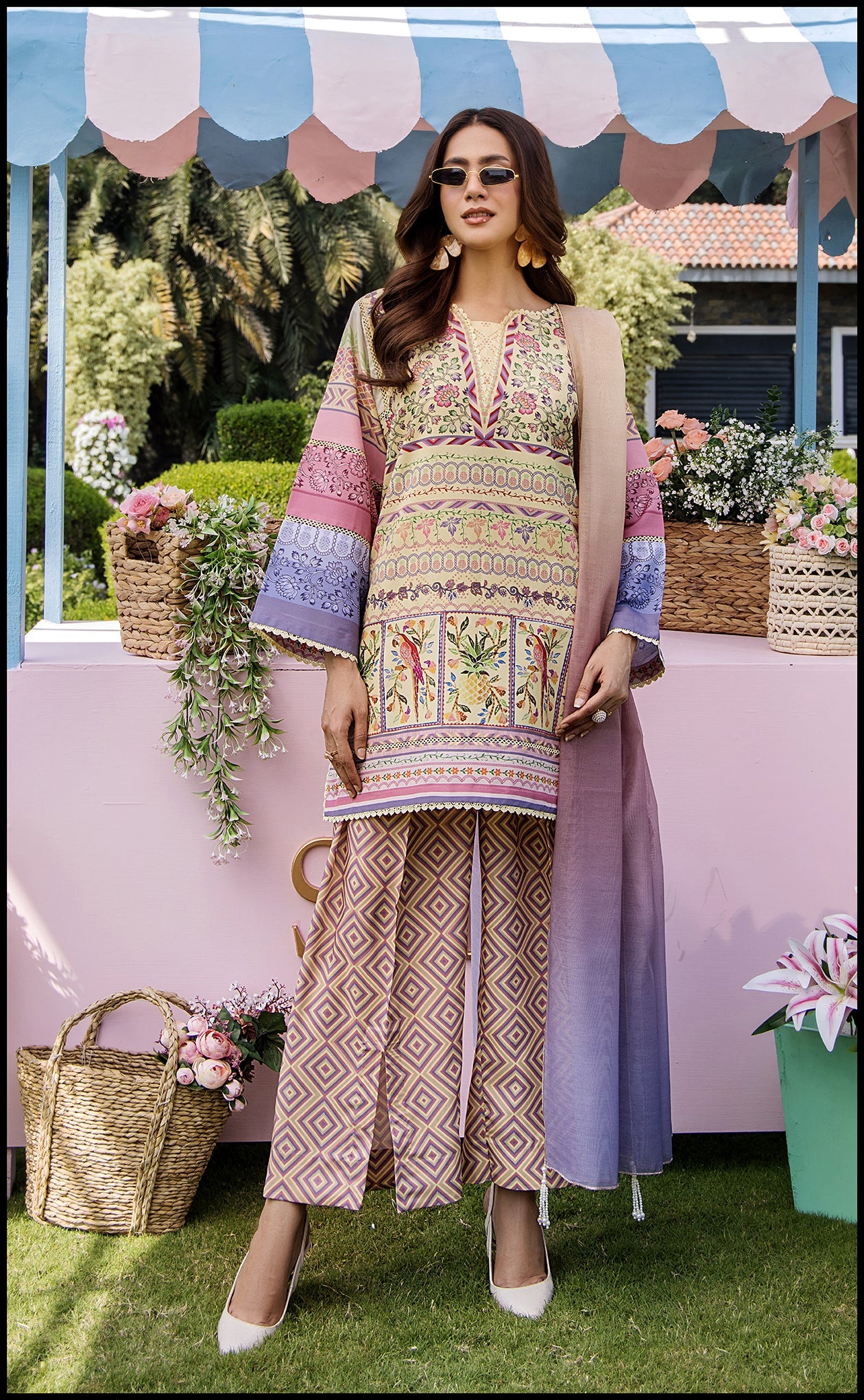 Embrace elegance in our delicately designed ensemble, featuring a graceful PP lawn silk shirt, a beautifully printed dupatta, and matching printed PP lawn silk trousers for a refined and sophisticated look.